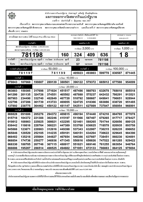 ใบตรวจผลสลากกินแบ่งรัฐบาล งวดประจำวันที่ 1 มิถุนายน 2557